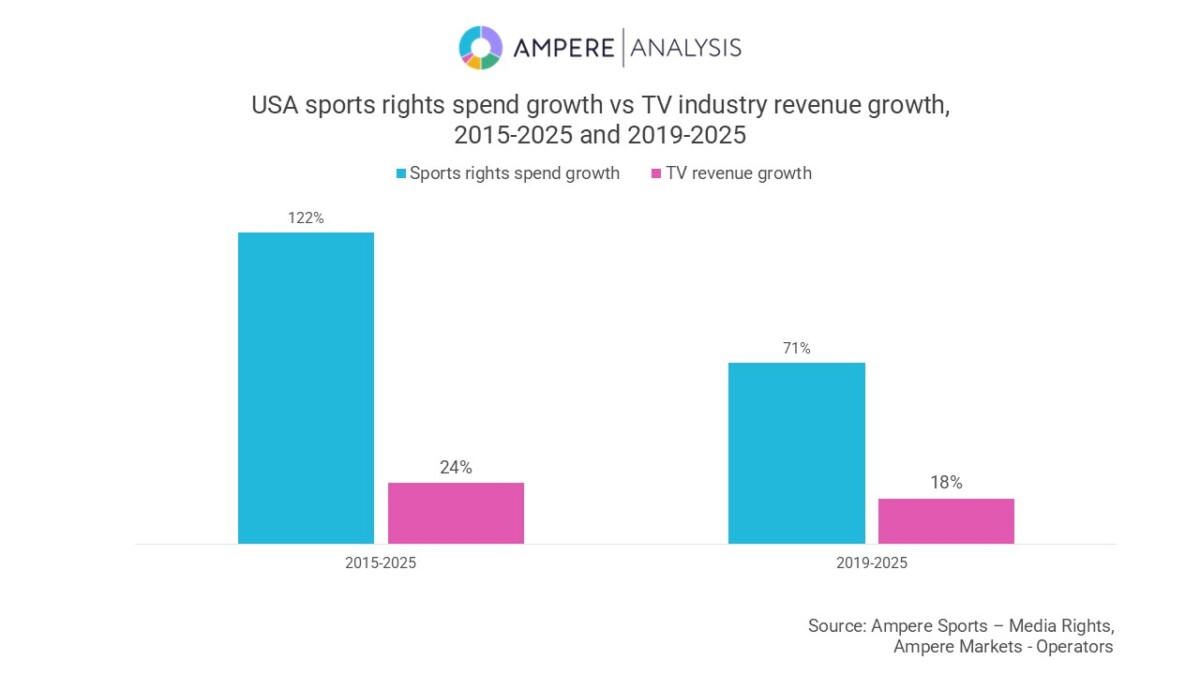 A new report from Ampere Analysis highlights the contrasting trajectories of sports media investment across the Atlantic. In the United States, broadcasters and streamers have driven spending on sports rights to $30.5 billion in 2025, more than double the $13.8 billion recorded in 2015. Over the same period, however, total TV industry revenues have grown by just 24%, from $172 billion to $213 billion, meaning that rights spending is increasing at a pace five times faster than the wider market.